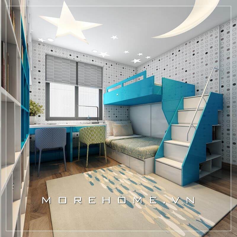 Để trang trí phòng ngủ của 2 bé trai hiện đại, ta sử dụng một chiếc giường ngủ 2 tầng đa năng, được tích hợp với nhiều ngăn tủ phía dưới giúp con có thể cất giữ sách vở, đồ dùng cá nhân của mình.