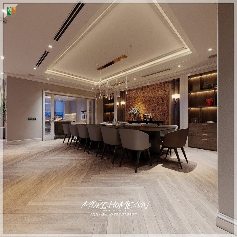 Không gian phòng ăn thêm sang trọng với bộ bàn ghế ăn gỗ tự nhiên bọc da cao cấp